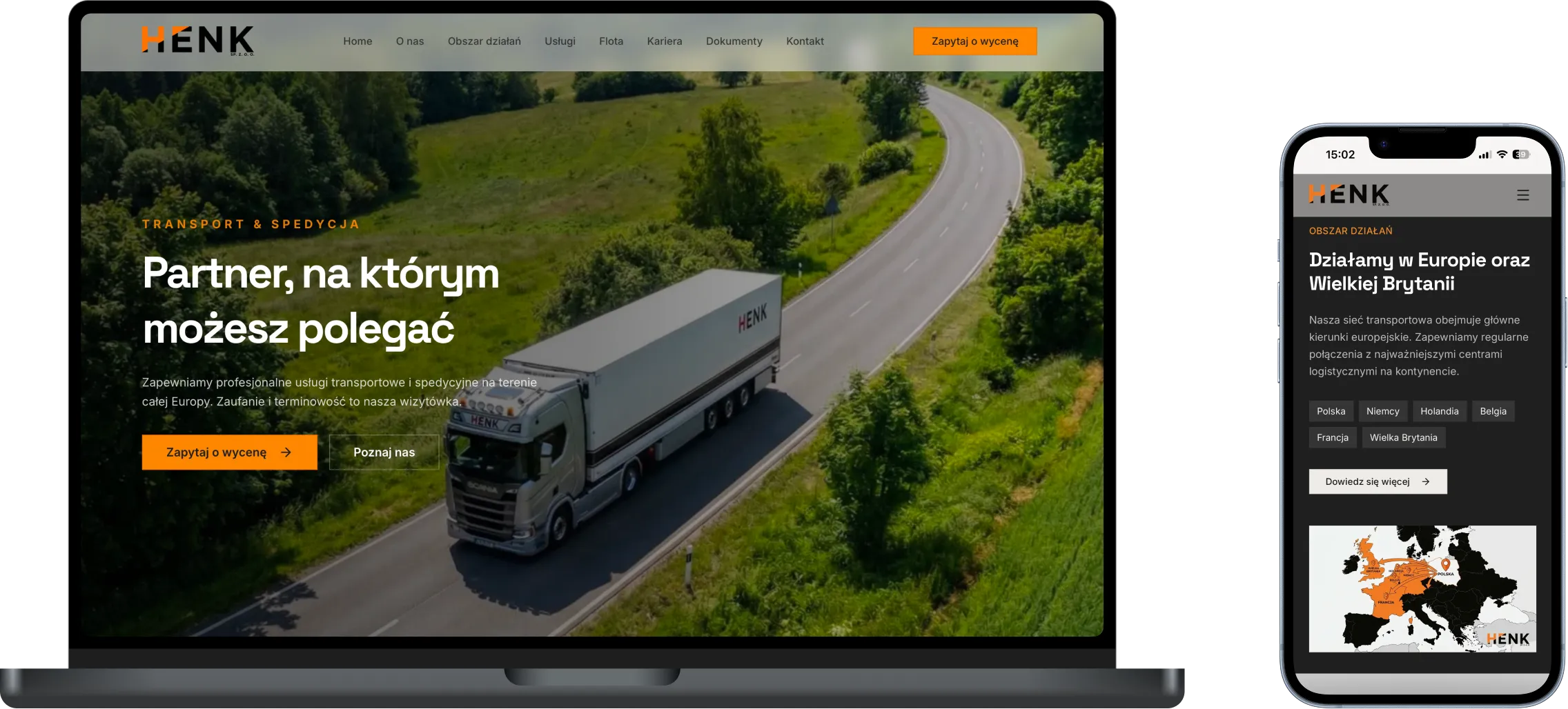 Profesjonalna strona korporacyjna dla firmy transportowo-spedycyjnej HENK sp. z o.o., specjalizującej się w transporcie chłodniczym i spedycji po całej Europie.